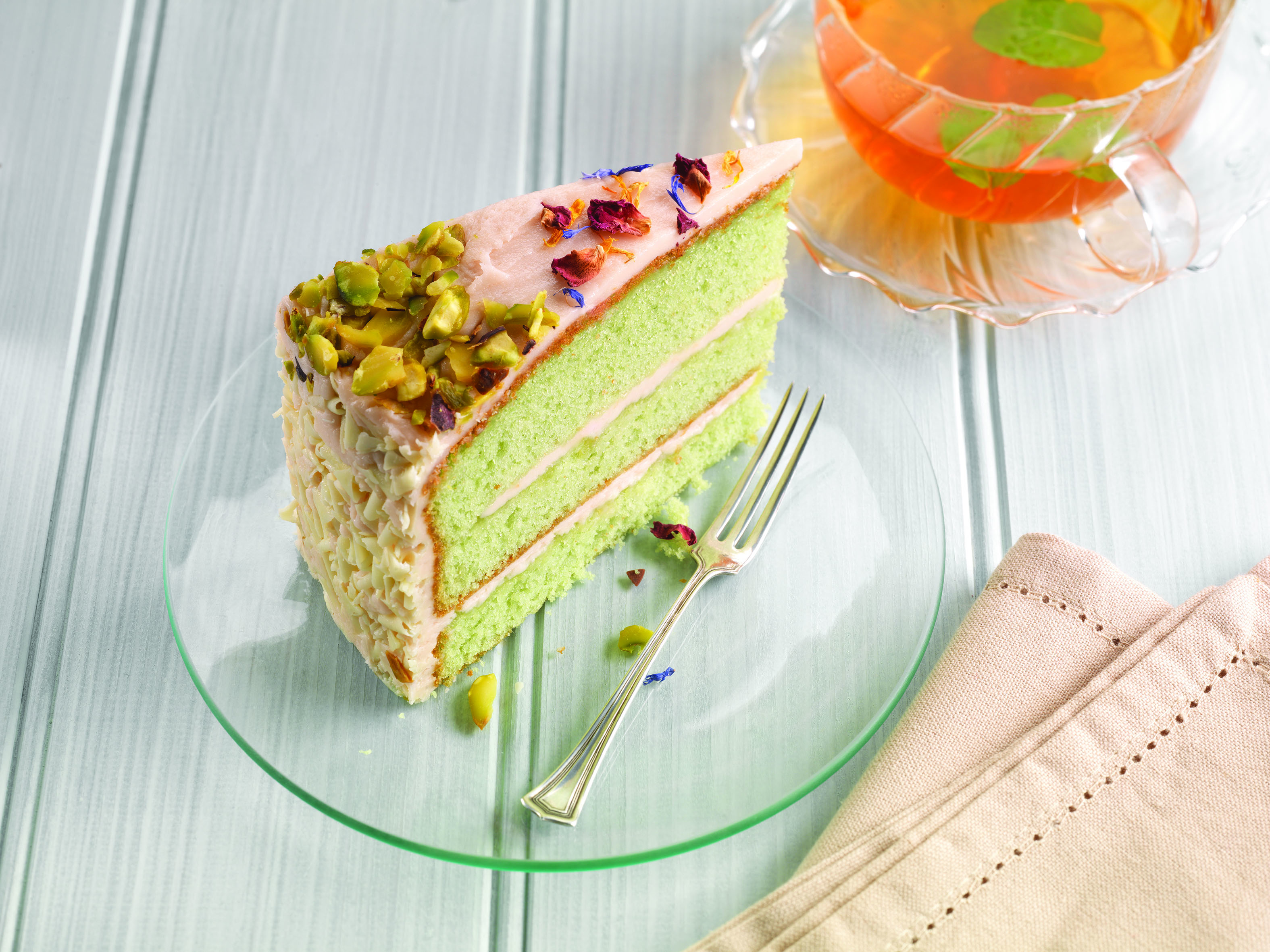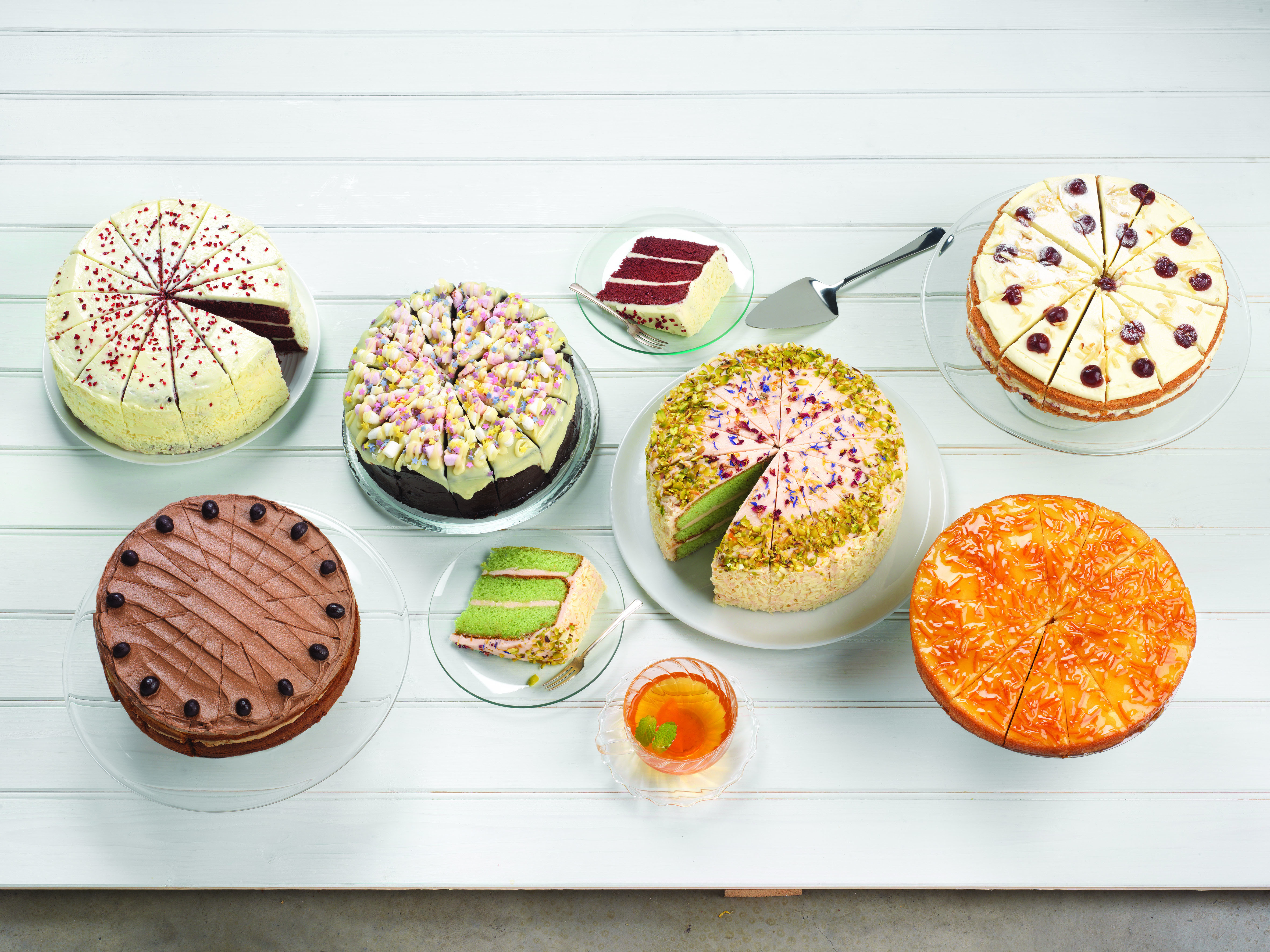 The range includes a triple-tiered Rose and Pistachio Cake hand-decorated with dried rose petals, hand-finished Cherry Bakewell Cake and a Raspberry, White Chocolate Prosecco Roulade with 25% Prosecco and an ambient-stable triple-tiered Red Velvet Cake.