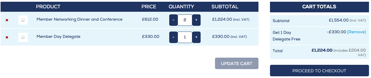 To select this offer put 3 tickets in your basket: 2 x Networking Dinner and Business Conference and 1 x Day Delegate or 3 x Networking Dinner and Business Conference and the 1 x day delegate amount will be discounted at the checkout.