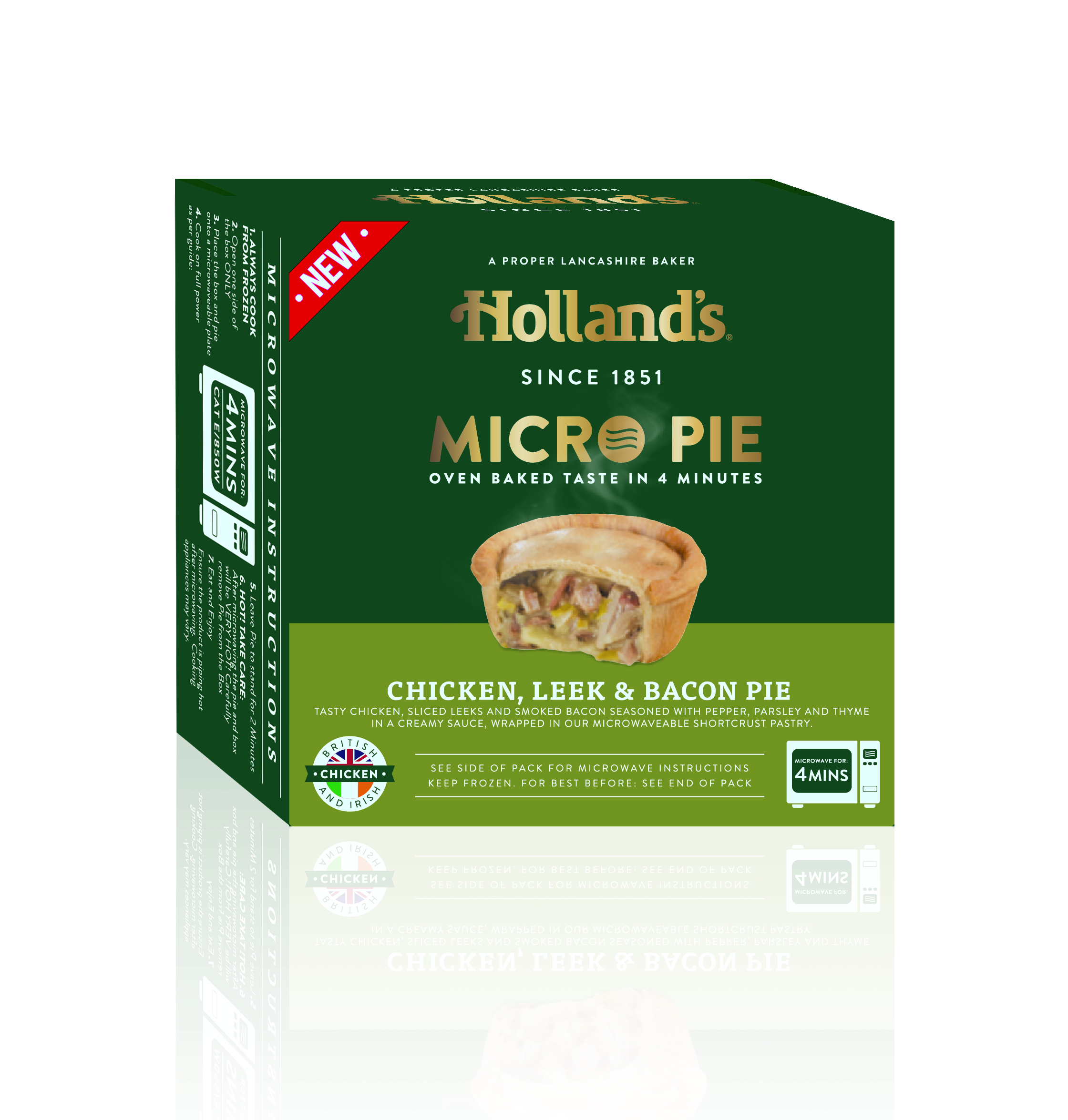 The Chicken, Leek & Bacon Micro Pie includes tasty British & Irish chicken, sliced leeks and smoked bacon, seasoned with pepper, parsley and thyme in a creamy sauce and baked in Holland’s new microwavable shortcrust pastry.  The Steak & Ale Micro Pie includes slow cooked tender prime steak in a light ale gravy, baked in Holland’s microwavable shortcrust pastry.  These new pies are sure to be a firm favourite for those wanting a tasty snack in just a matter of minutes or as an ideal pairing with mash or mushy peas.