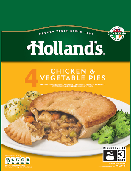 Holland’s, the number one North West brand in individual pies and puddings with 67% of SOT and 24% share nationally*, continues to develop its product range with a new variety of a frozen pie and pudding.  New 4 pack Chicken and Vegetable Pies and New four pack Minced Beef and Onion Puddings.