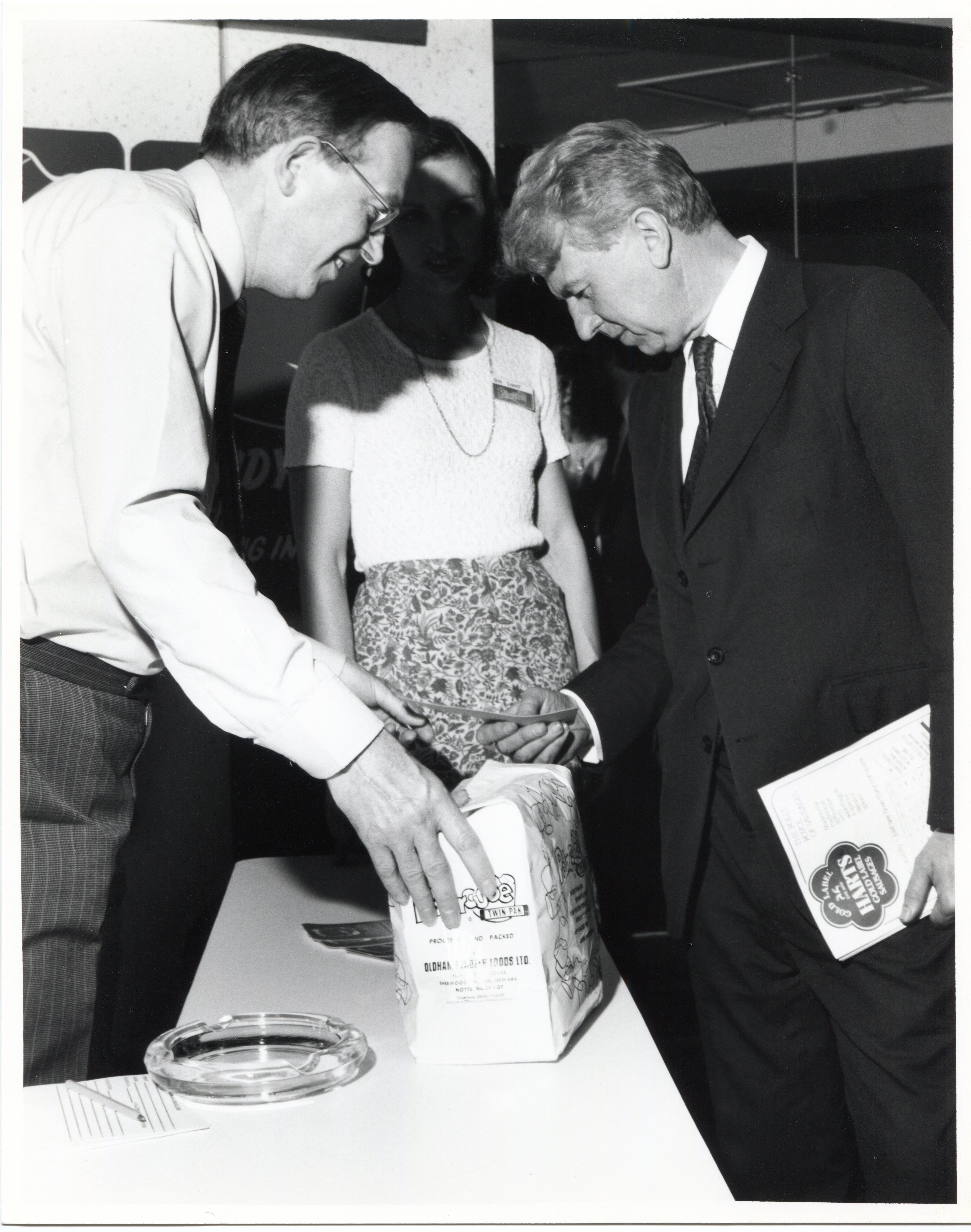 John Oldham in 1981, discussing the prototype of the new laminated Polarcube party pack with Rt Hon. Peter Walker, Minister of Agriculture, Fisheries and Food. The pack, designed to break into the retail market, later won UK and World packaging awards.