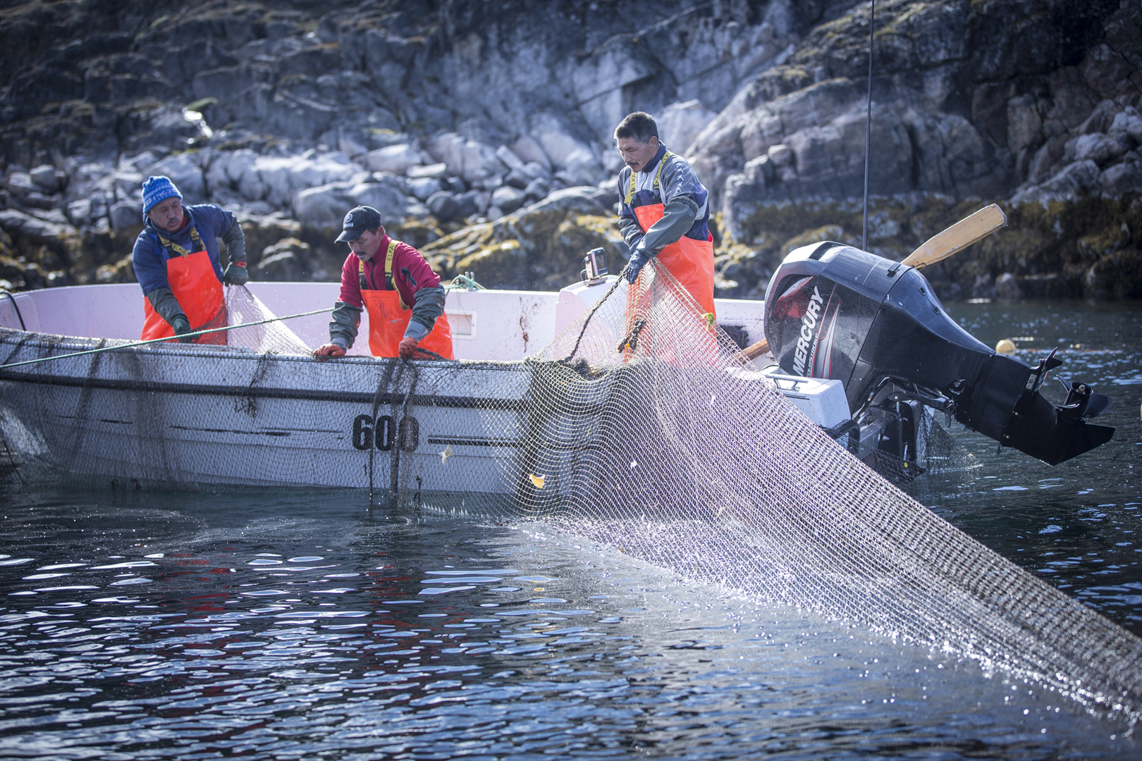 Local fisherman working in collaboration with Royal Greenland place net traps next to rocky outcrops to catch the fish in a traditional and low-impact fishing method that is size and species selective and environmentally friendly.